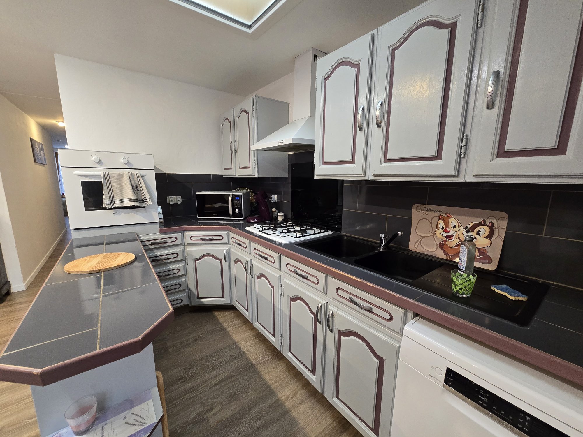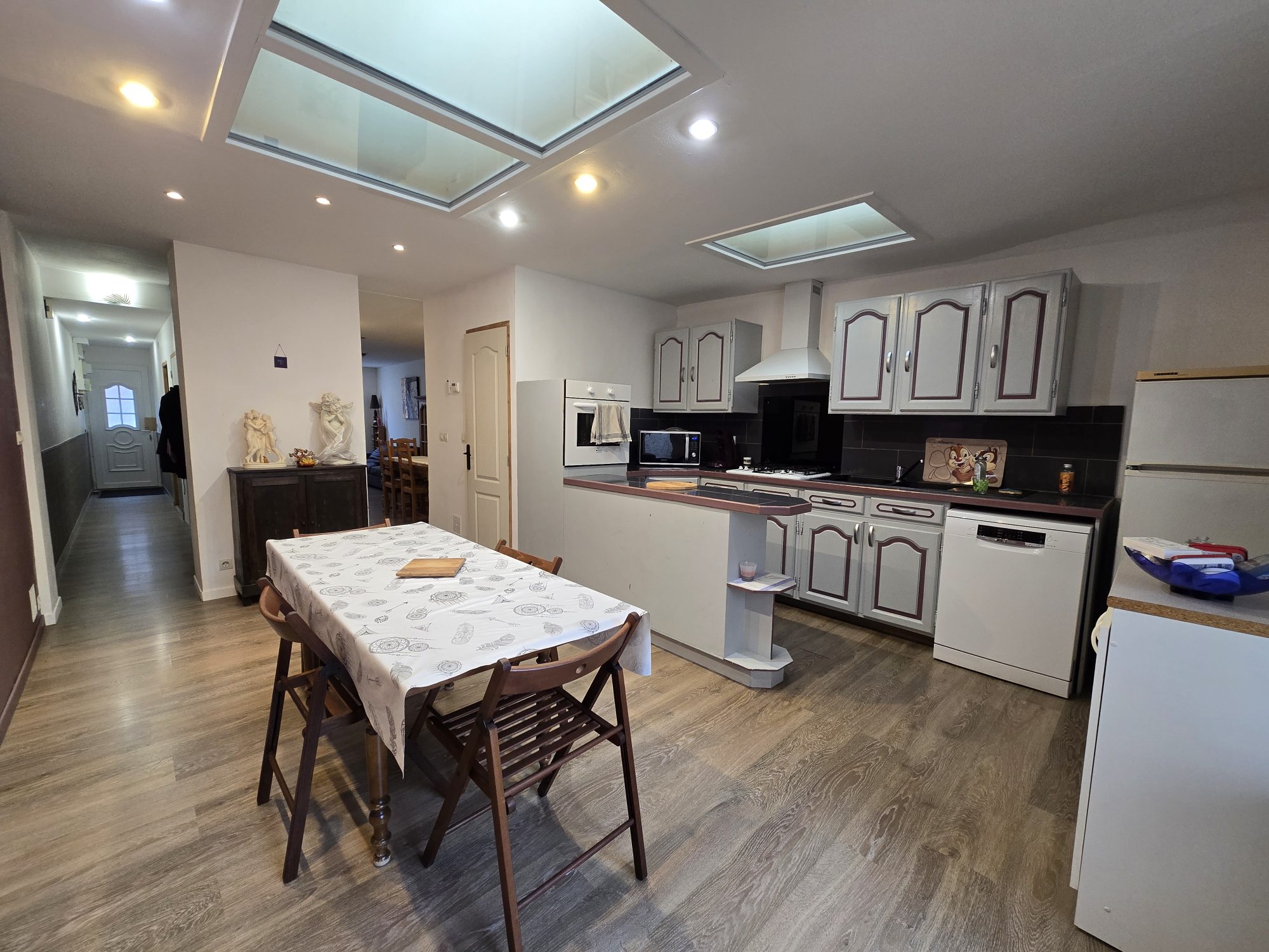 Au rez-de-chaussée : couloir d'entrée, séjour salon, cuisine meublée avec coin repas, salle d'eau avec wc.