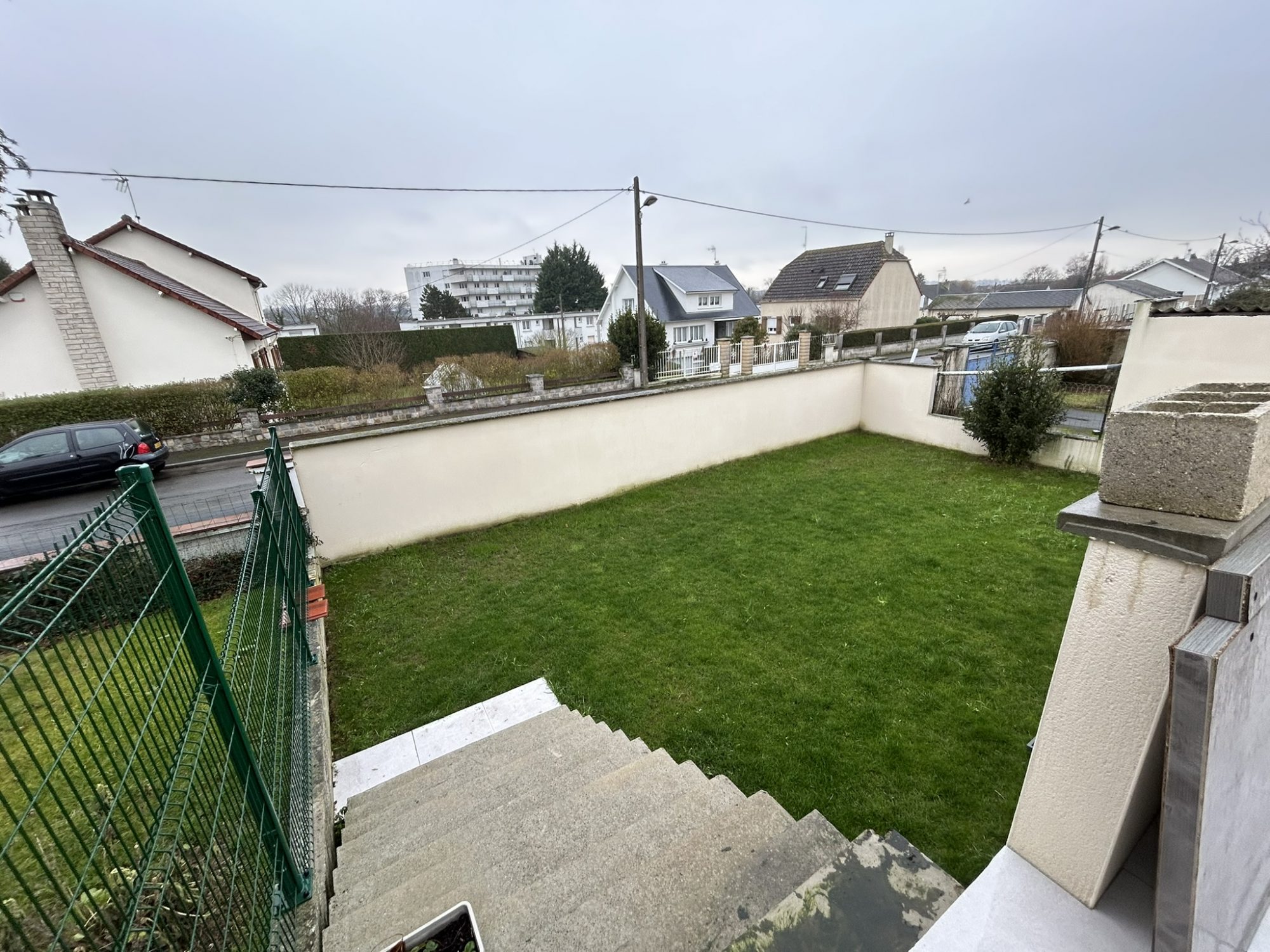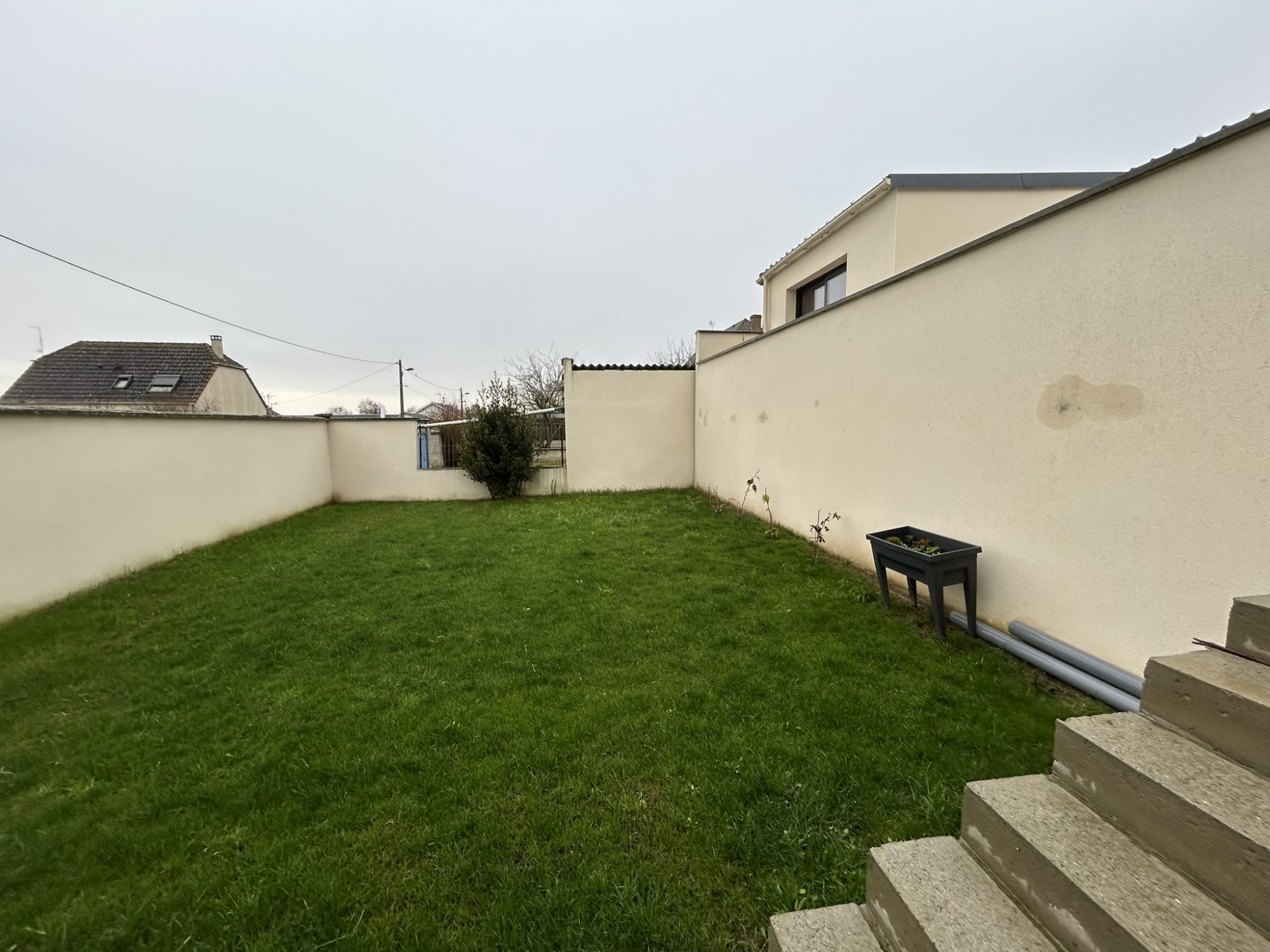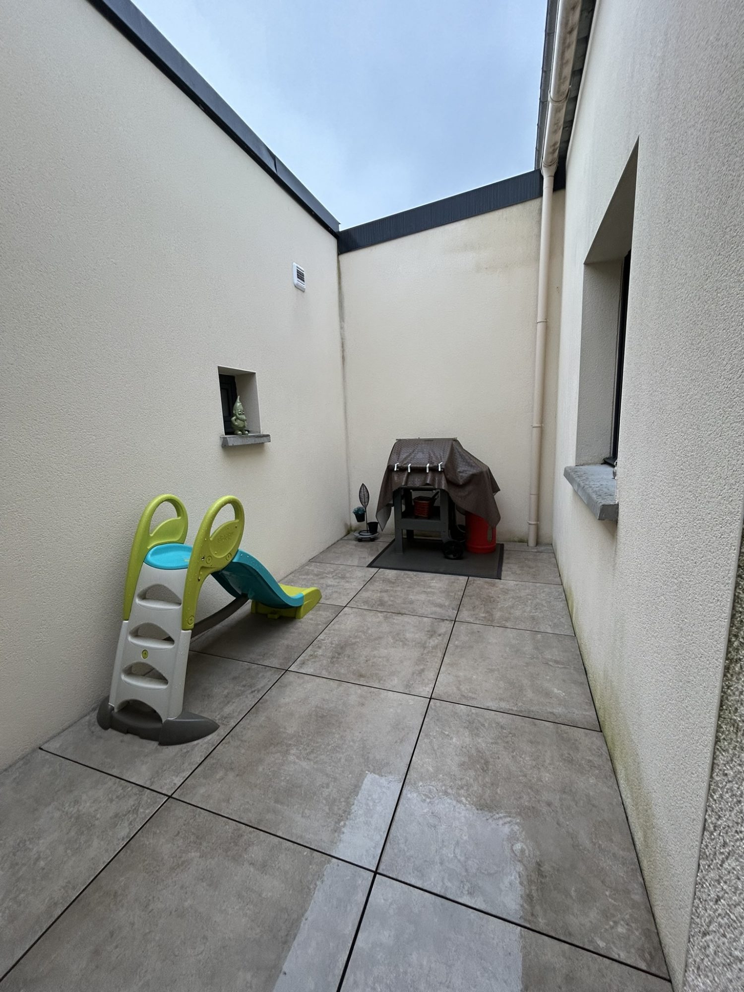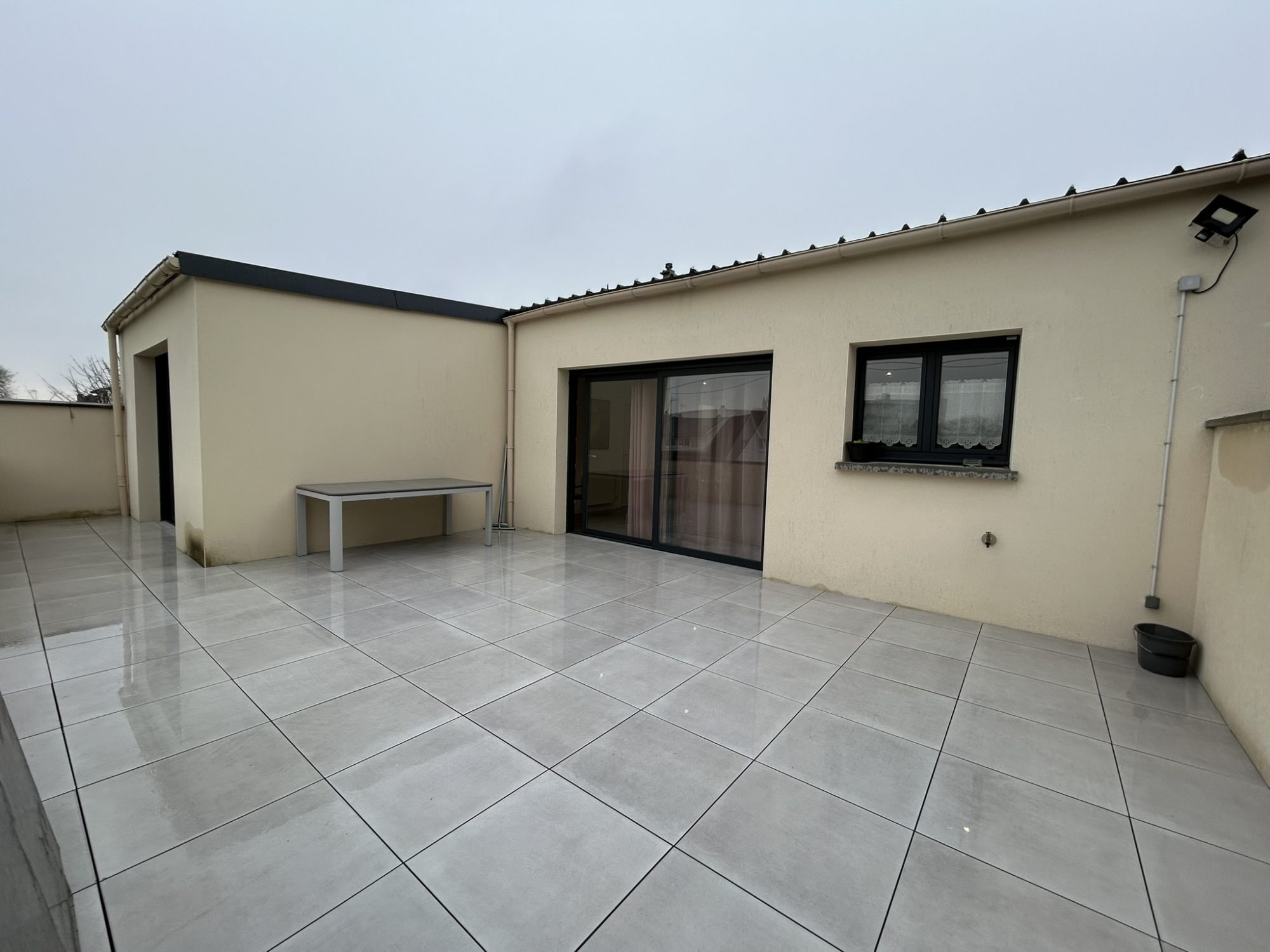 Très belle terrasse carrelée et jardin, patio, chauffage électrique.