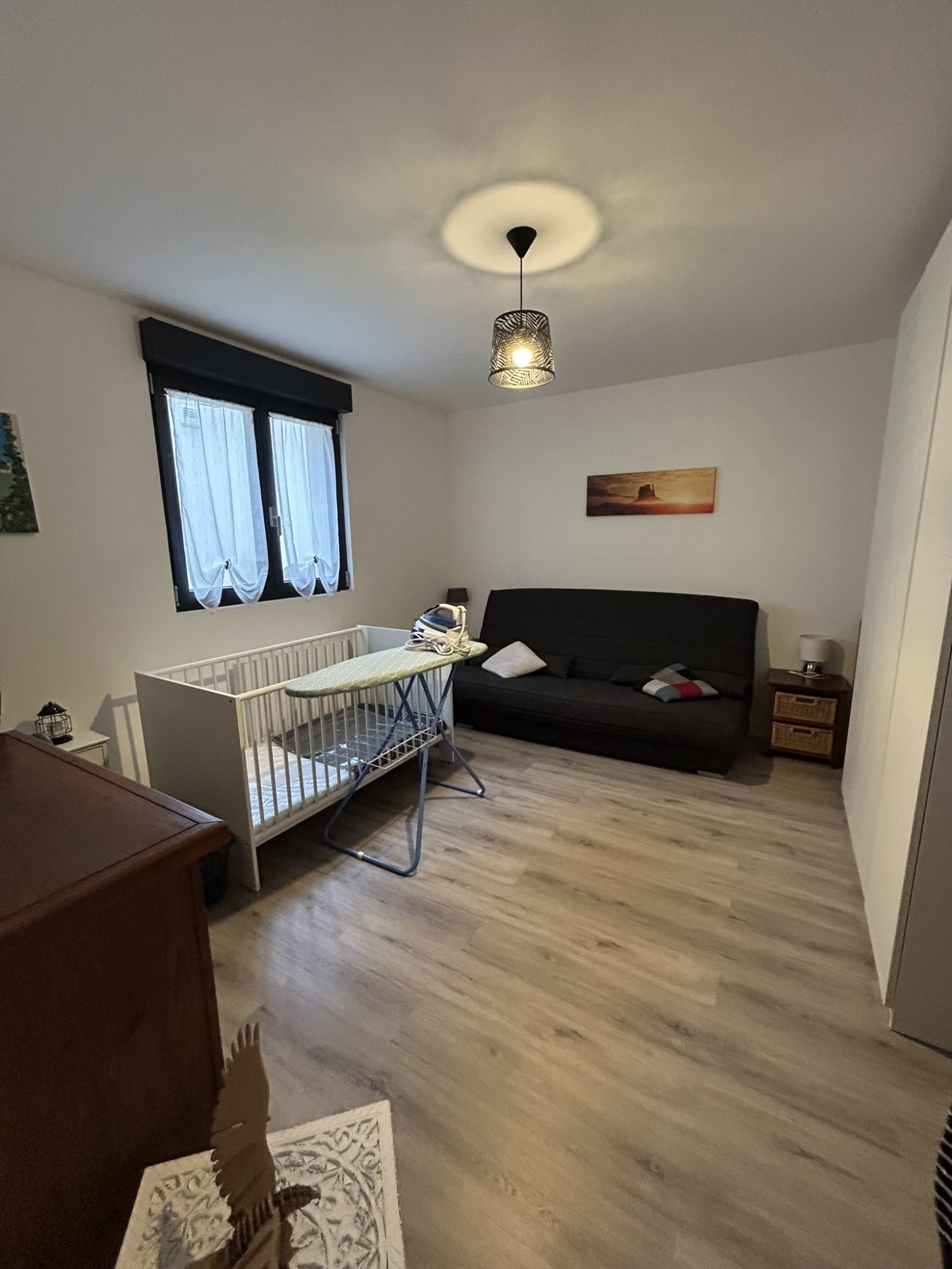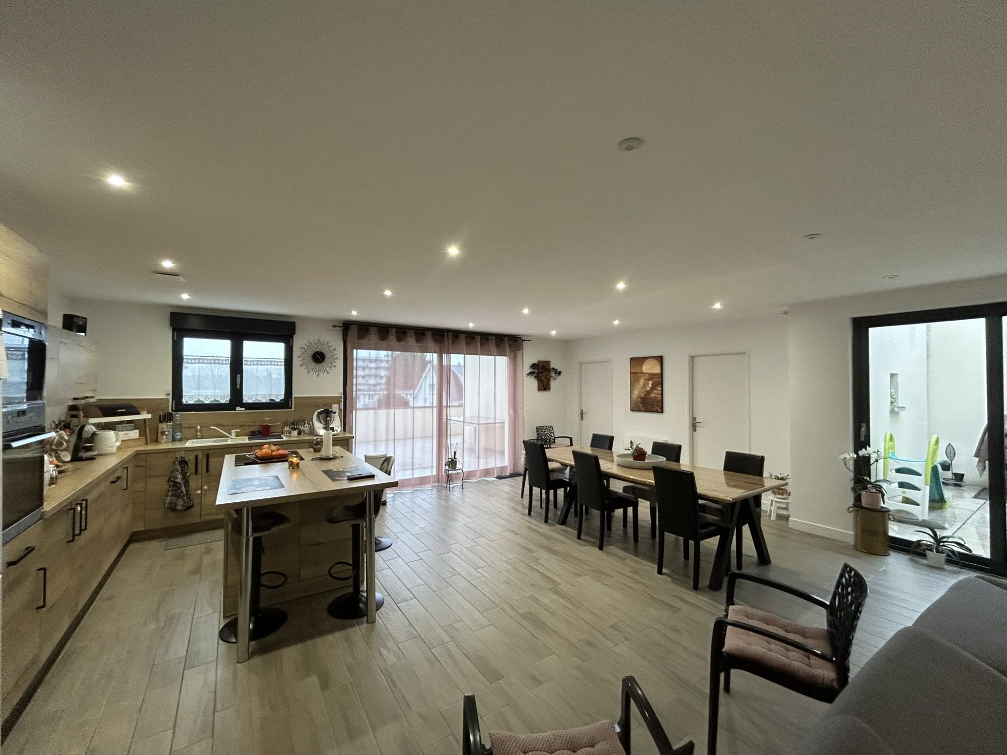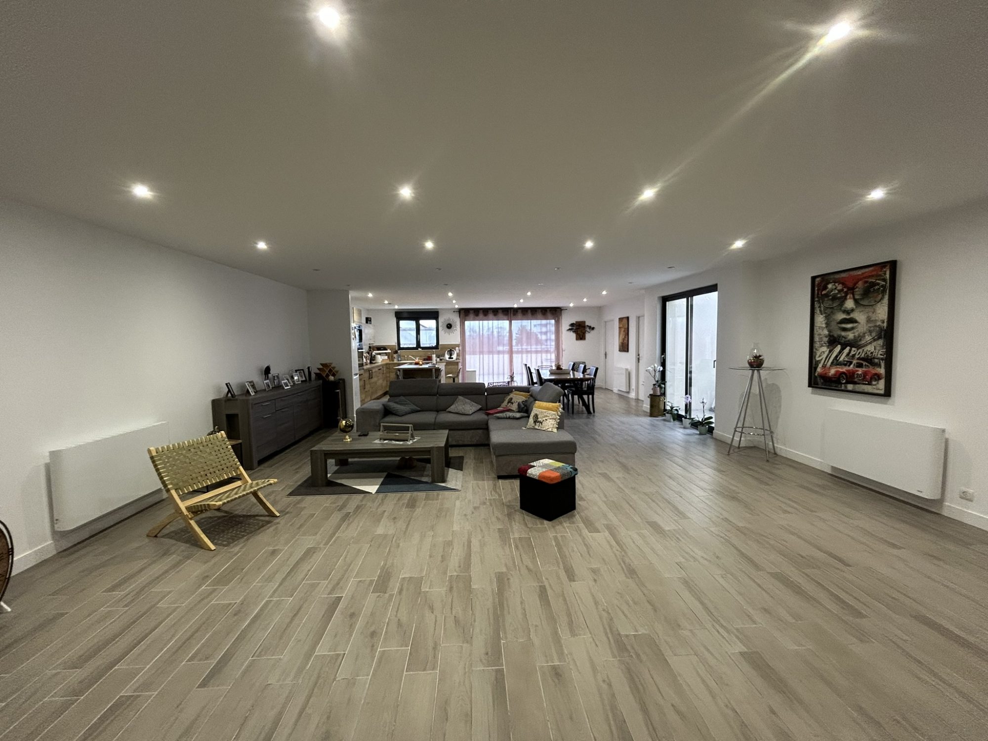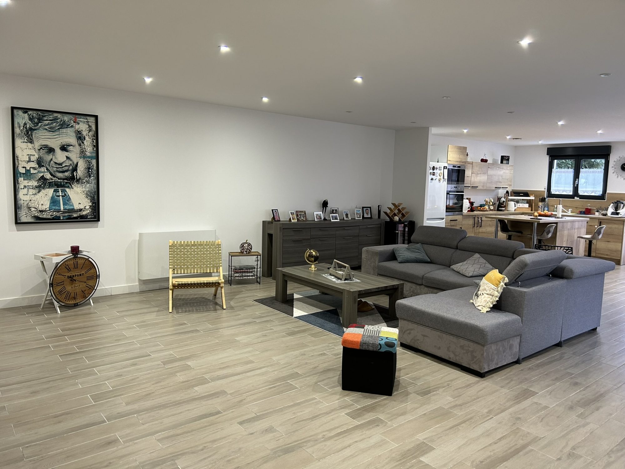 Une grande pièce à vivre séjour et cuisine équipée de 89m², 3 chambres, salle de bains + douche, WC, lingerie/cellier et grand garage.