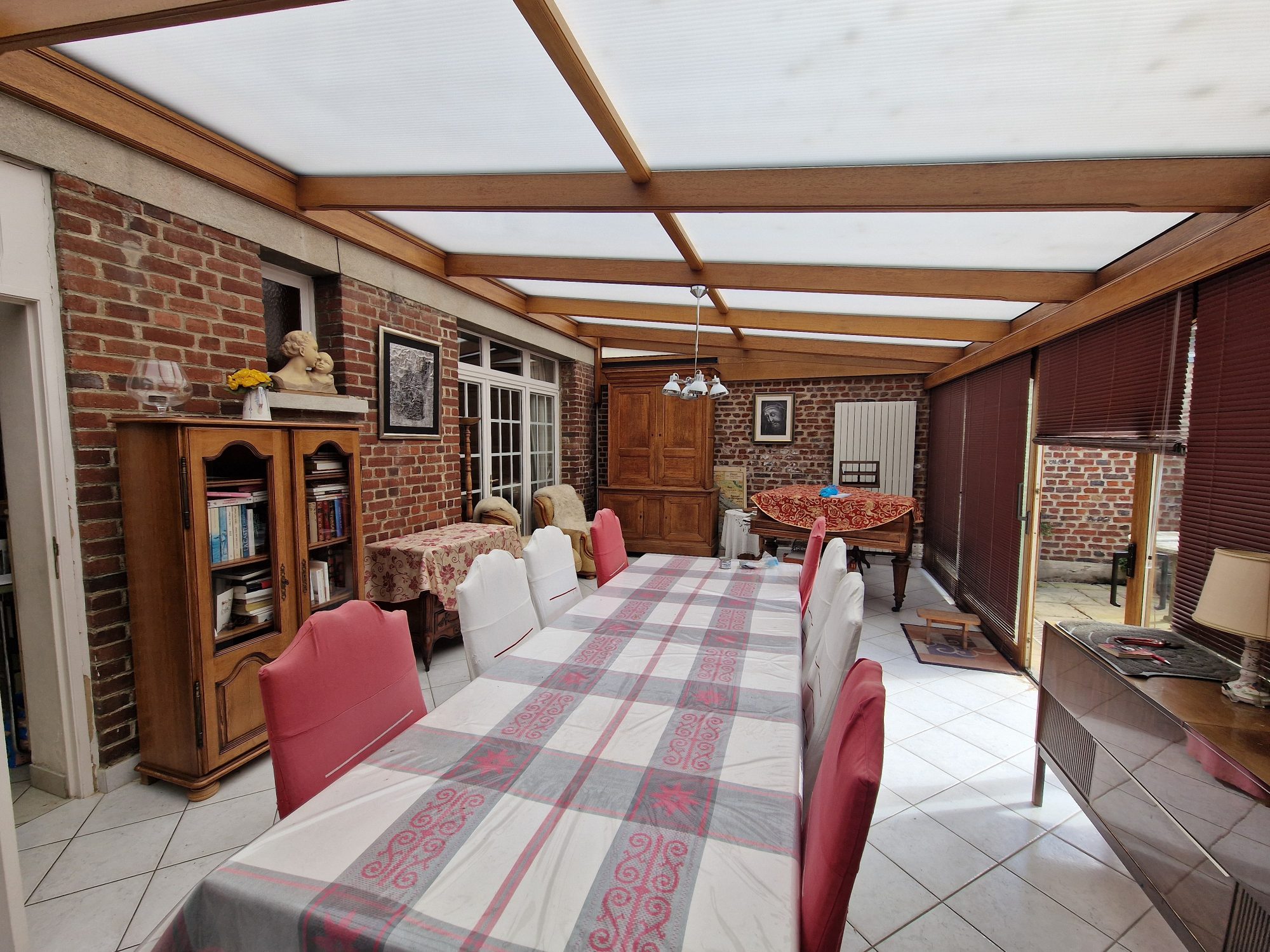 Au rez-de-chaussée : entrée, salon-séjour, cuisine, wc, grande véranda avec wc, deux pièces sous aggrandissement avec point d'eau.