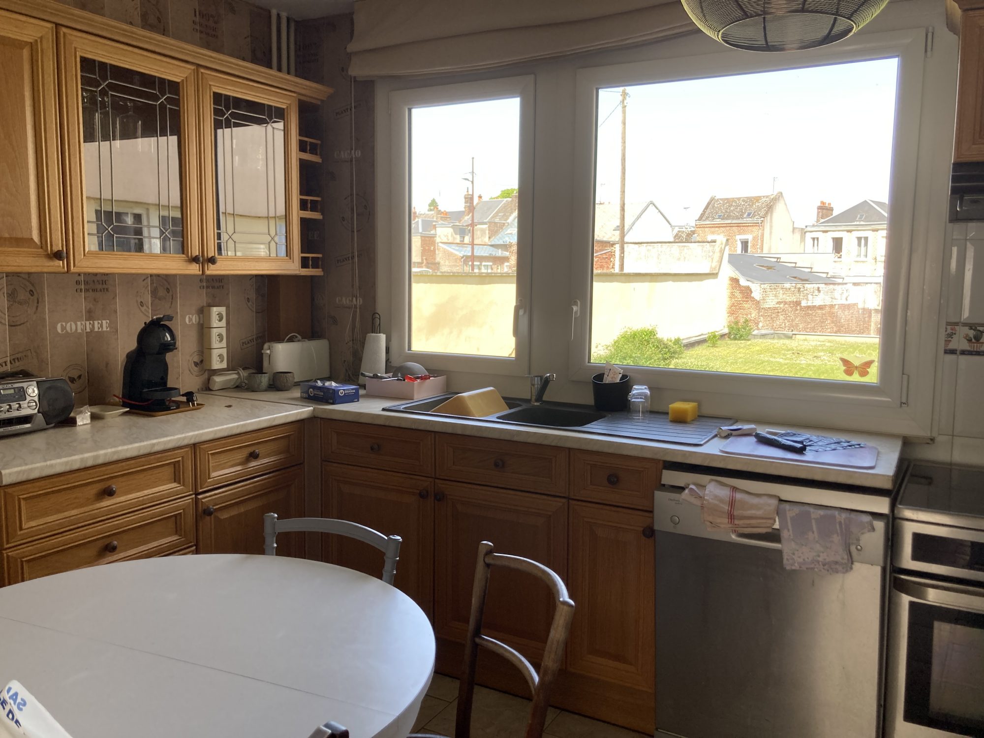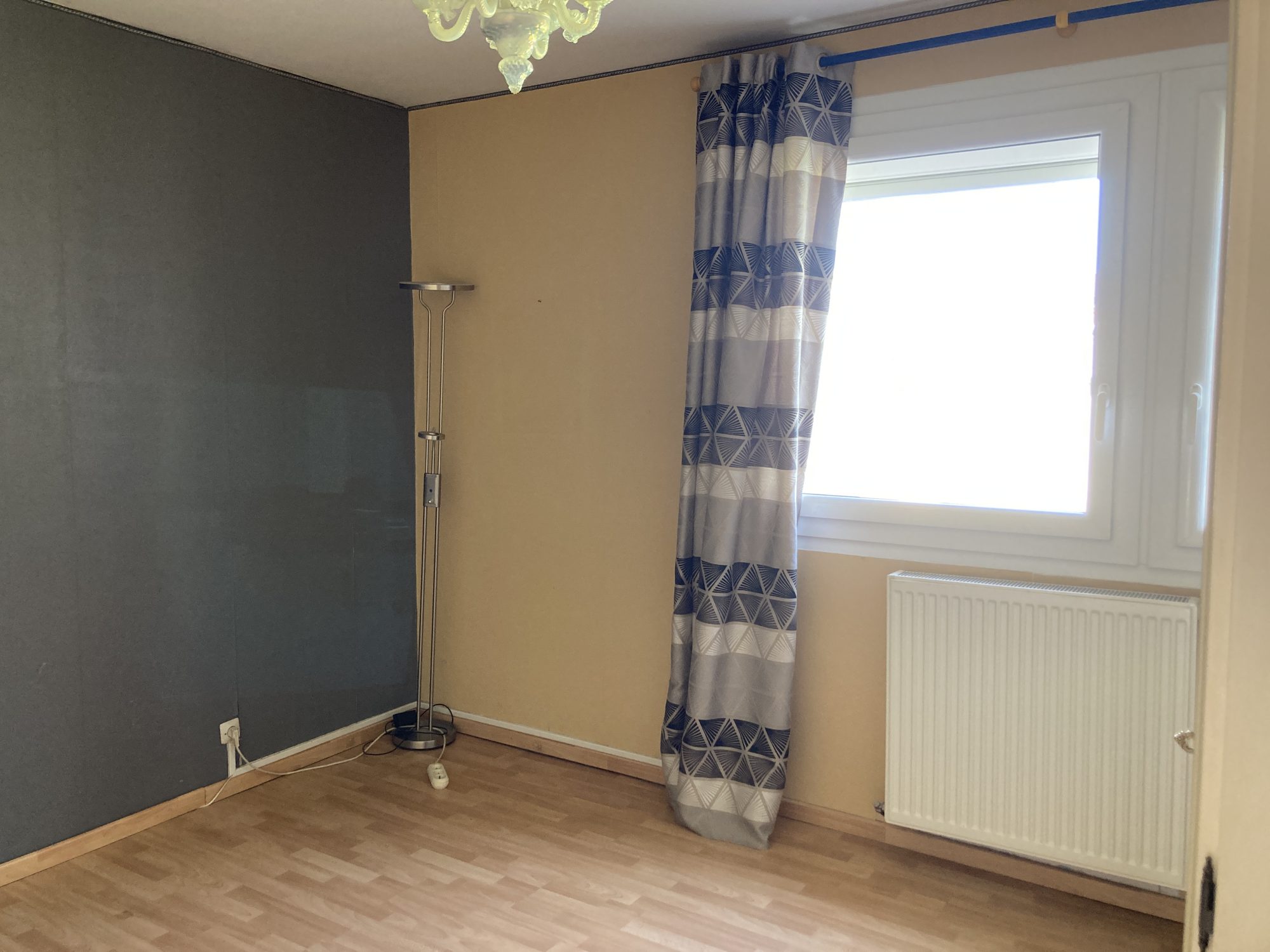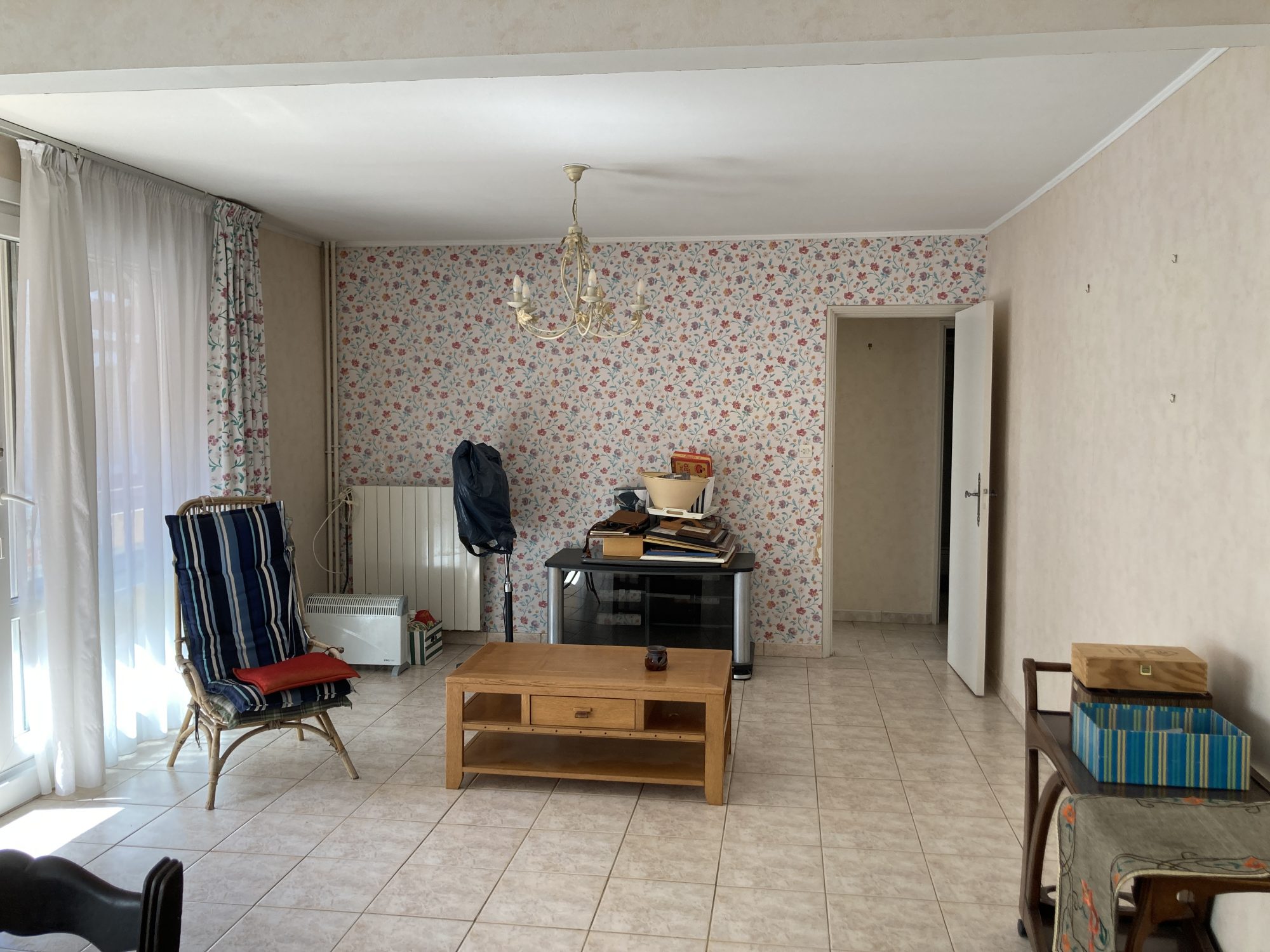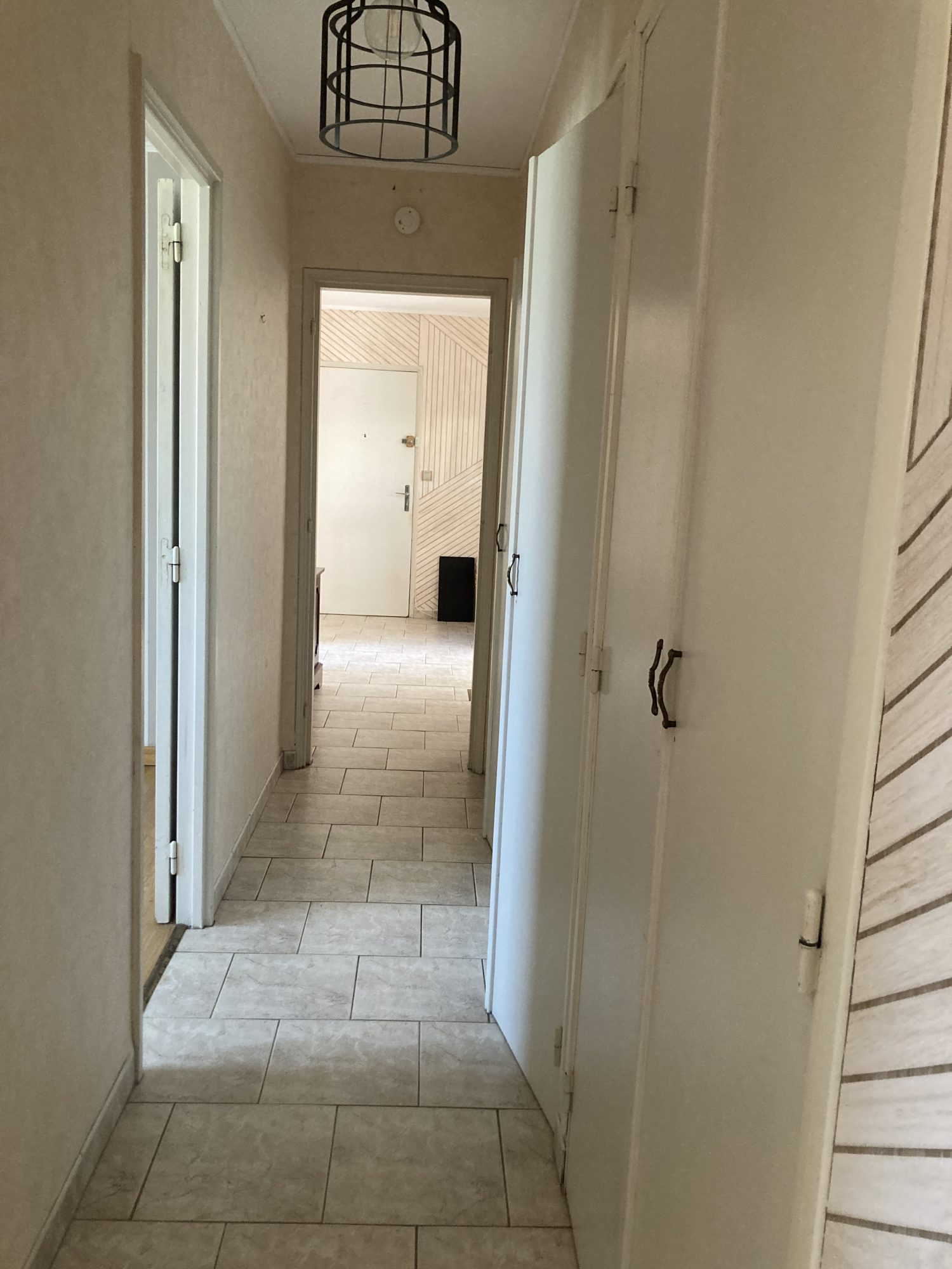 Grande entrée avec placard, séjour salon 37m², cuisine meublée, couloir desservant 3 chambres, salle d'eau et wc.