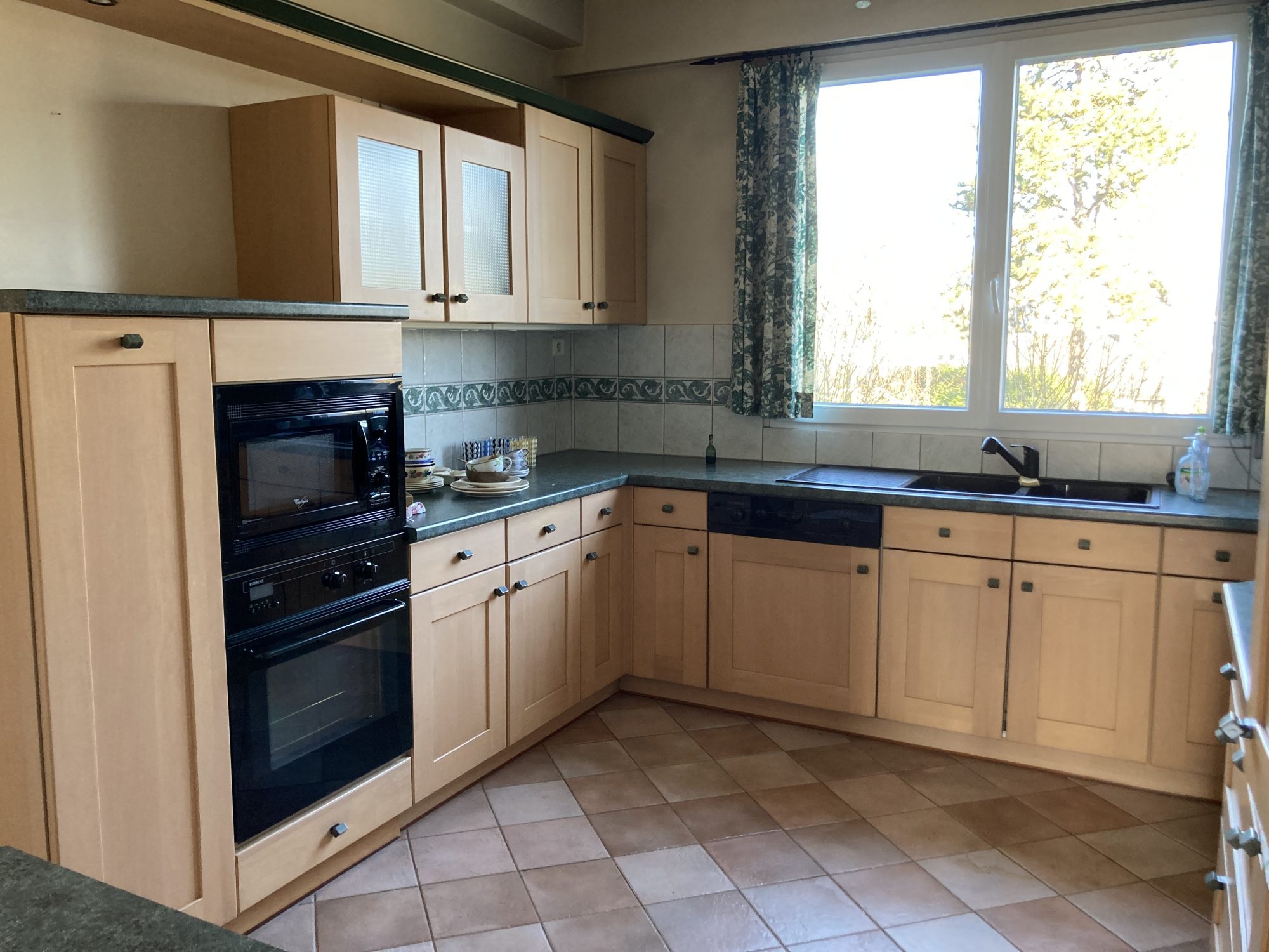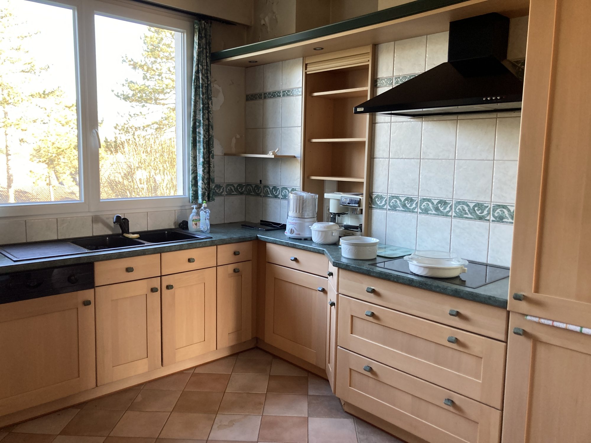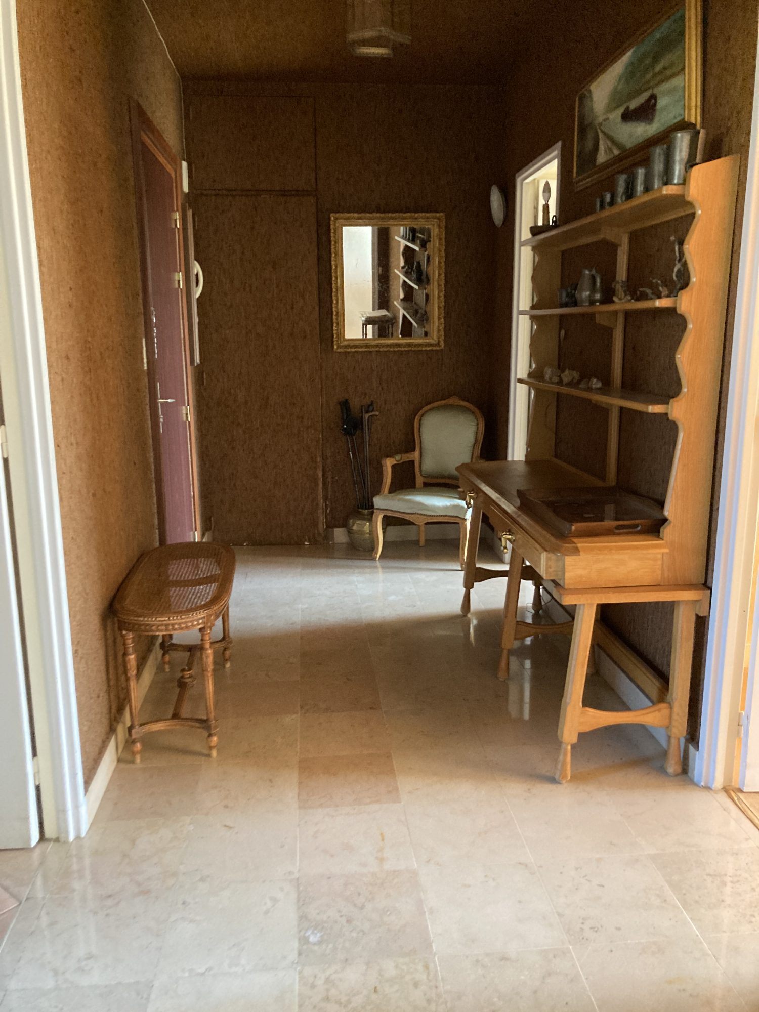 Grande entrée travertin, séjour salon 49m², cuisine équipée, cinq chambres, salle de bains, wc, cabinet de toilette.