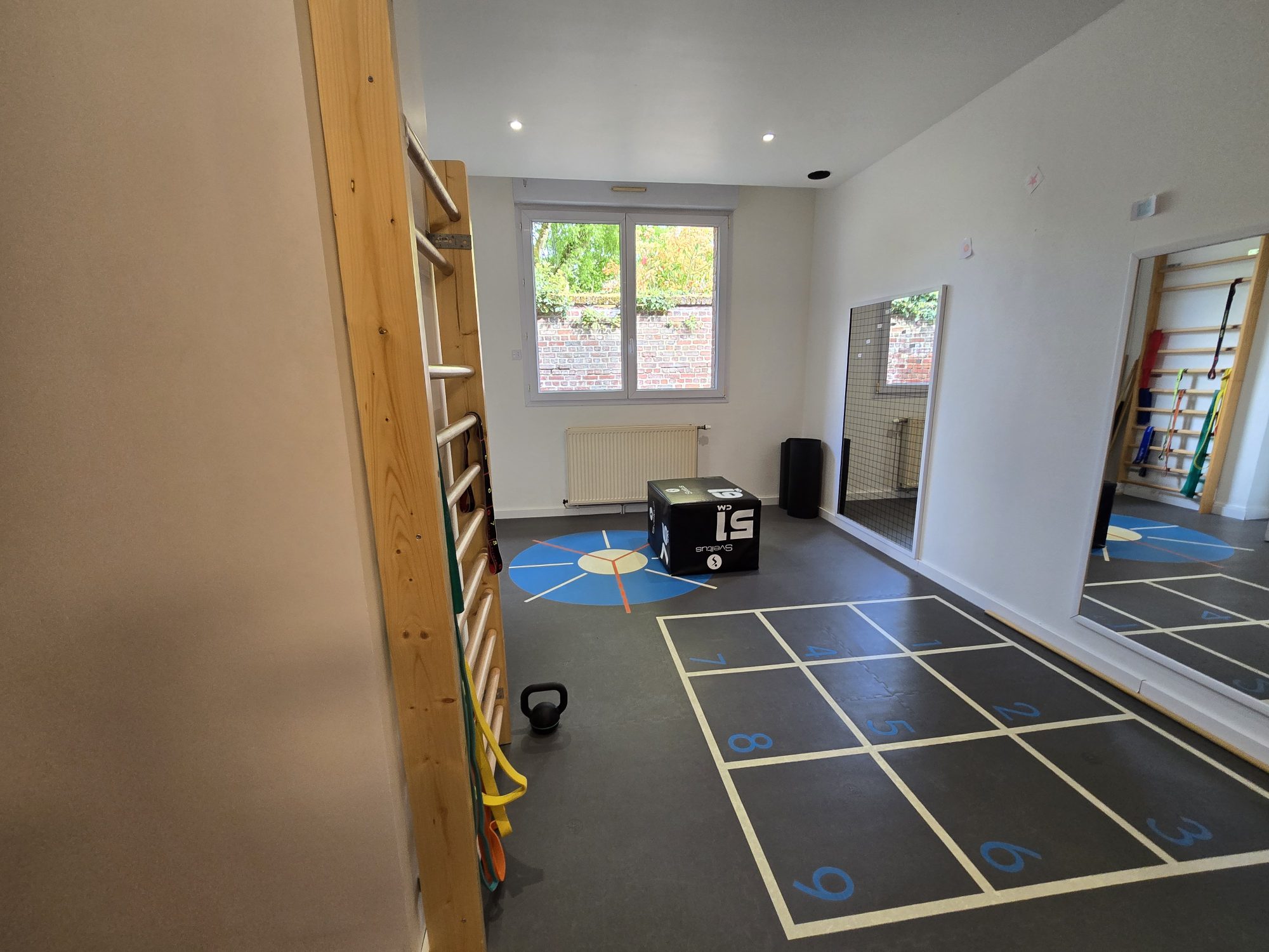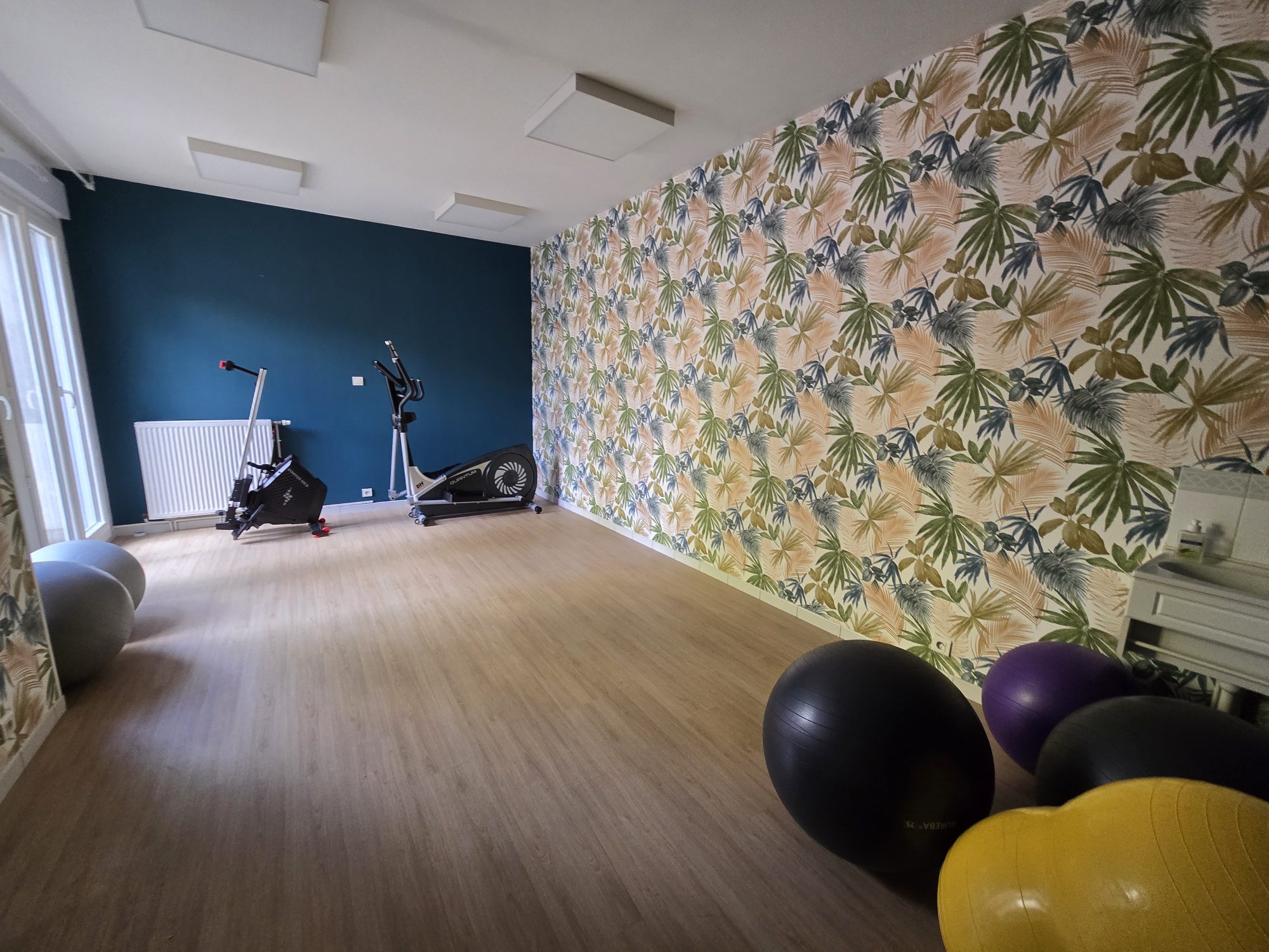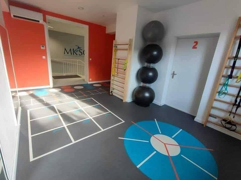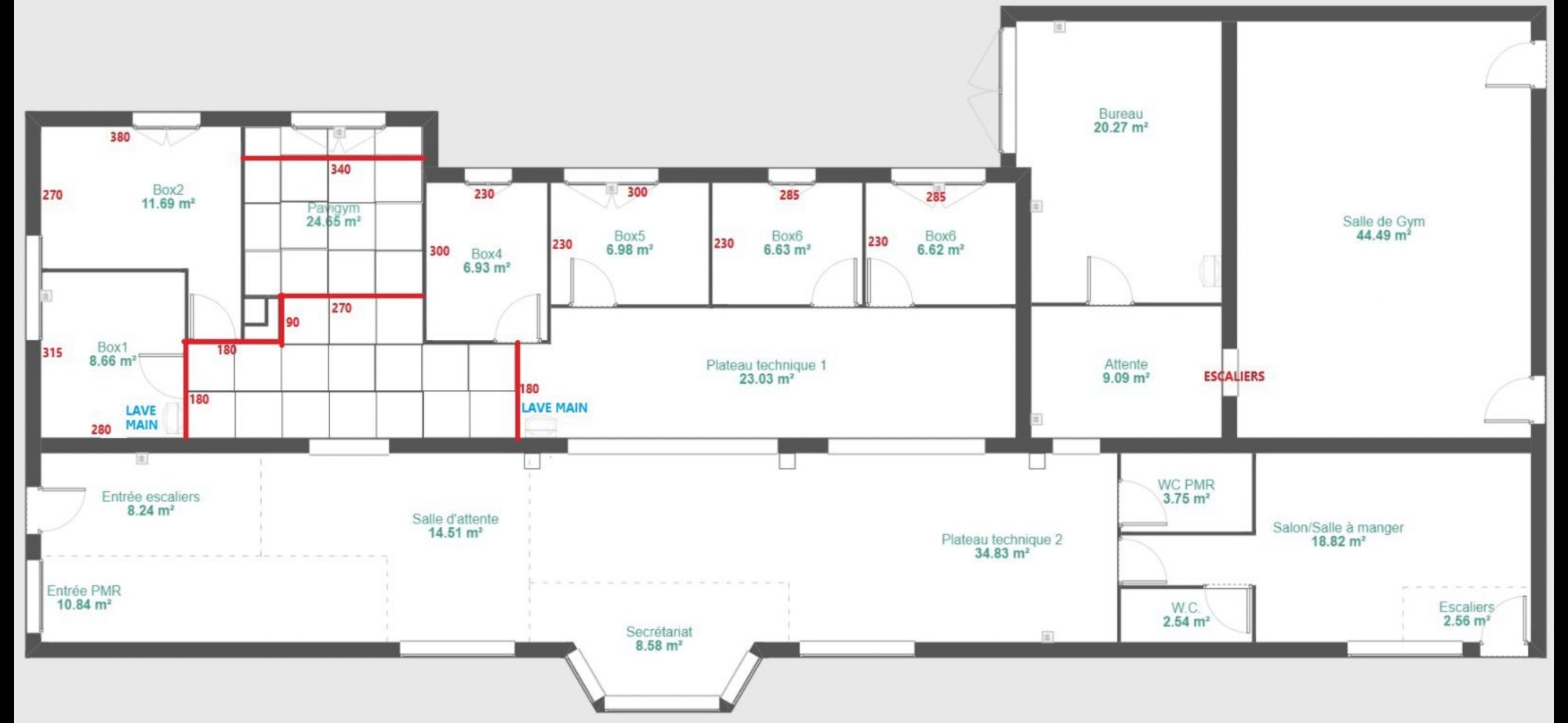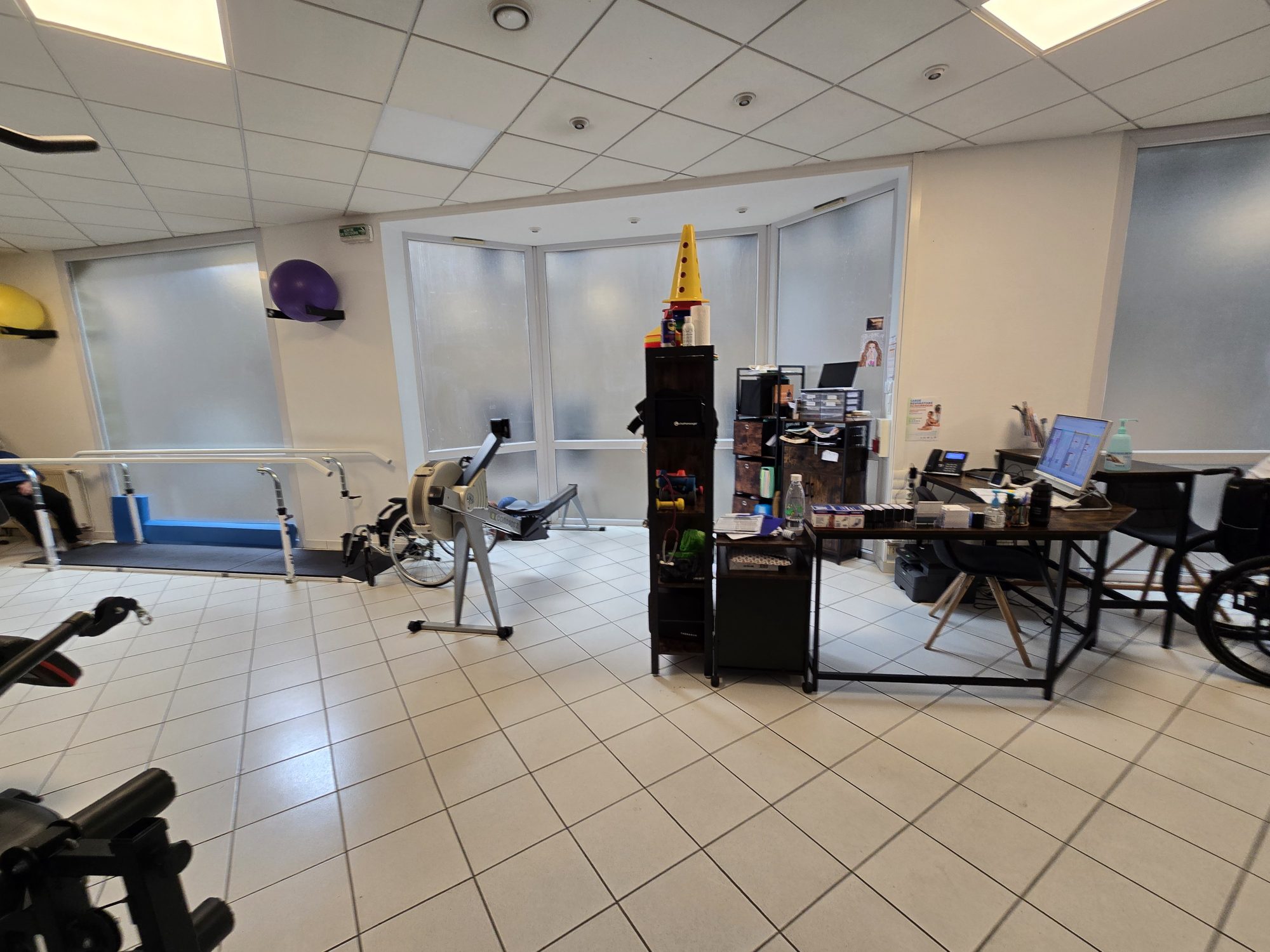 Hall d'entrée, salle d'attente, 6 boxs, espace ouvert d'environ 80m², 2 salle de gym dont une de 45m², wc PMR.
