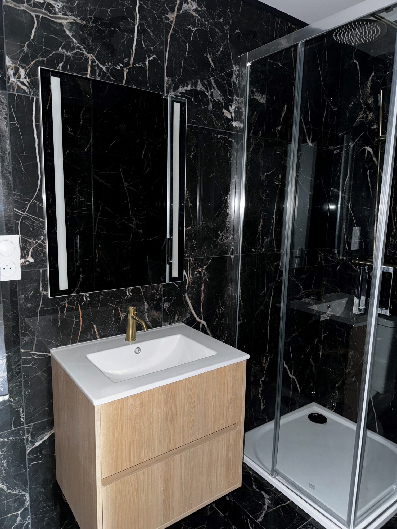 Au rez-de-chaussée une cellule commerciale (laverie) de 41m² louée 550€HT, une cellule de 50m² (pizzeria) louée 650€HT.