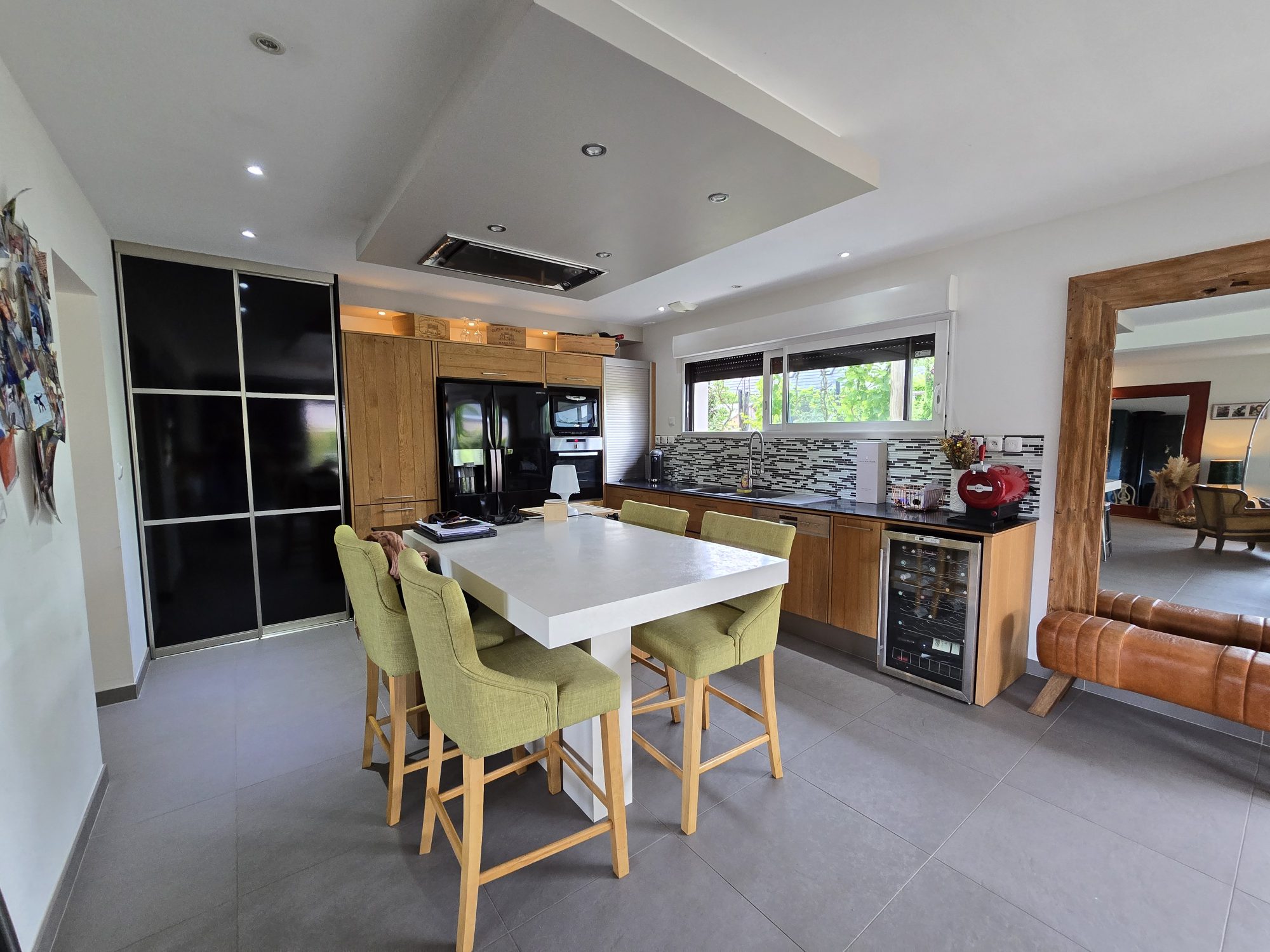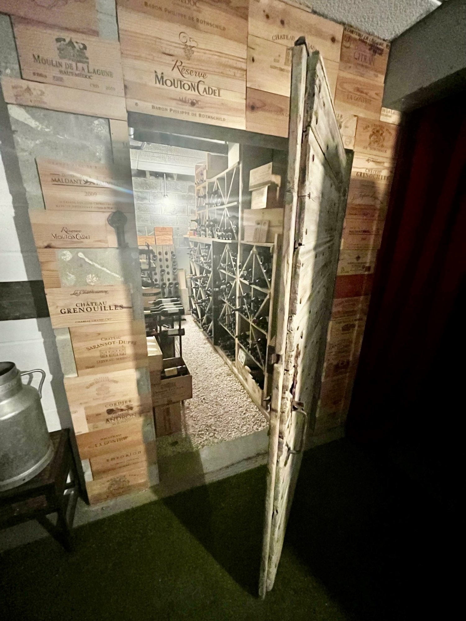 Sous-sol complet comprenant : garage 4Vl, salle de jeux, stockage et cave à vin.