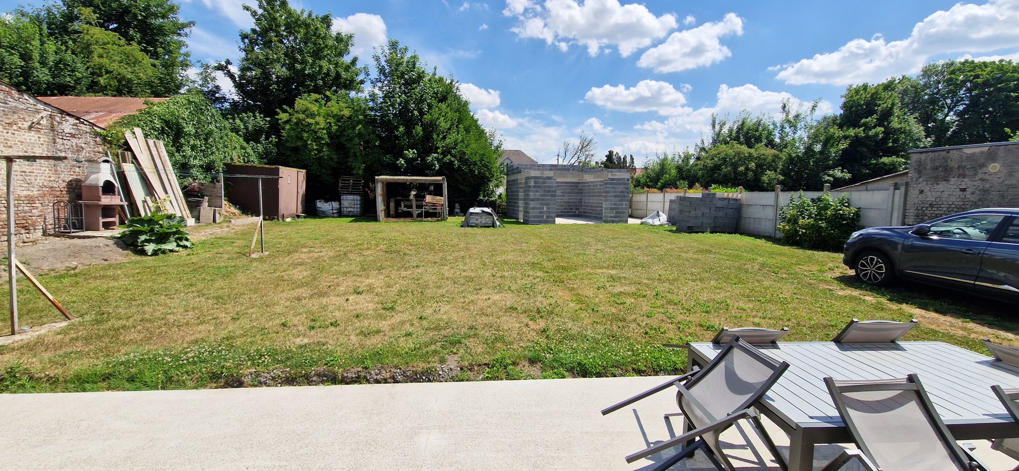 Chauffage par clim (+feu), terrasse, jardin avec dépendance, garage en construction et petit garage étroit sur le côté.