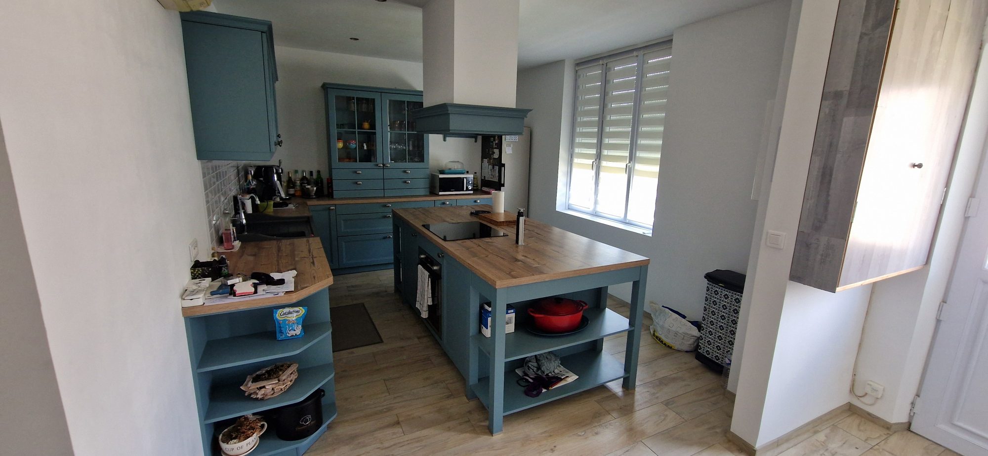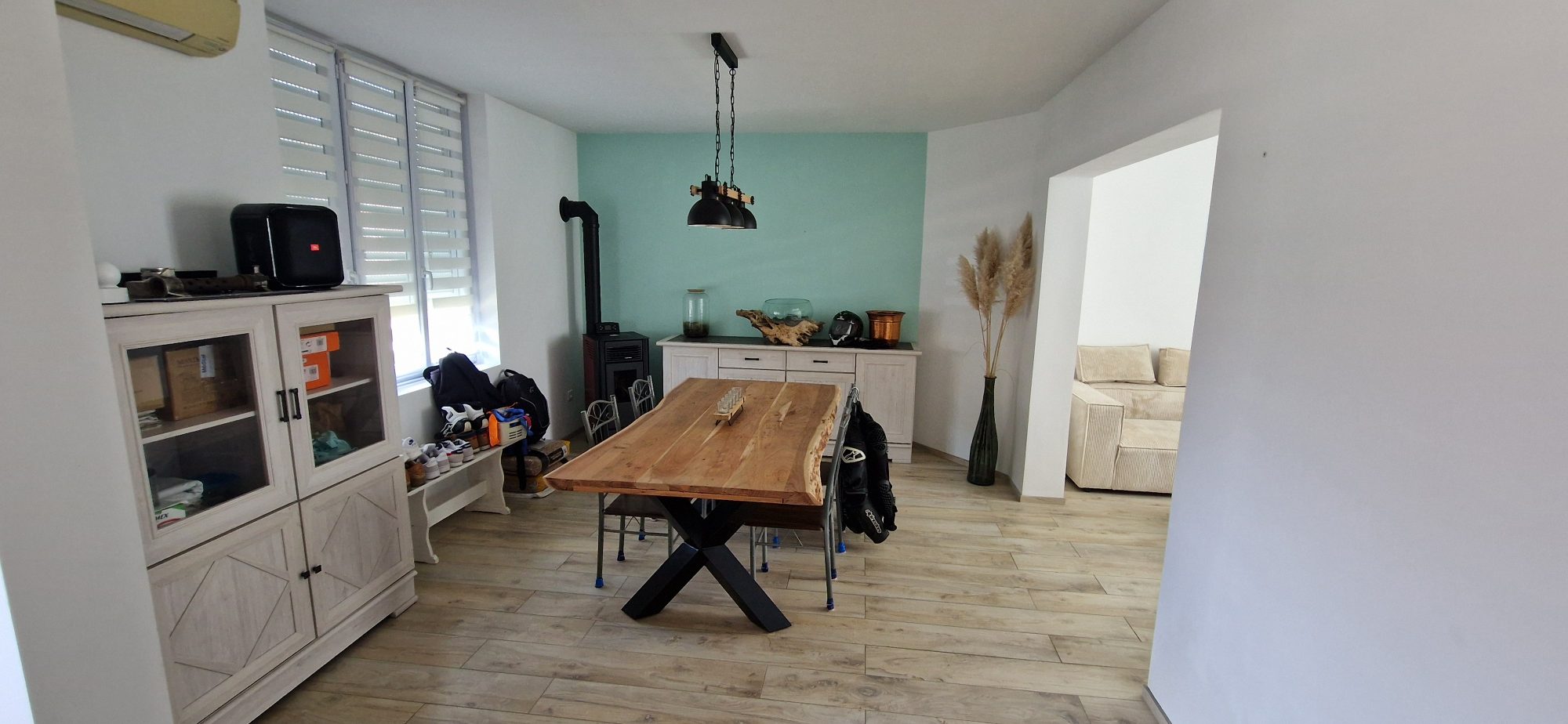 Au rez-de-chaussée : entrée centrale ouverte sur une grande pièce à vivre séjour et cuisine équipée avec feu à granulés, salle d'eau et wc.