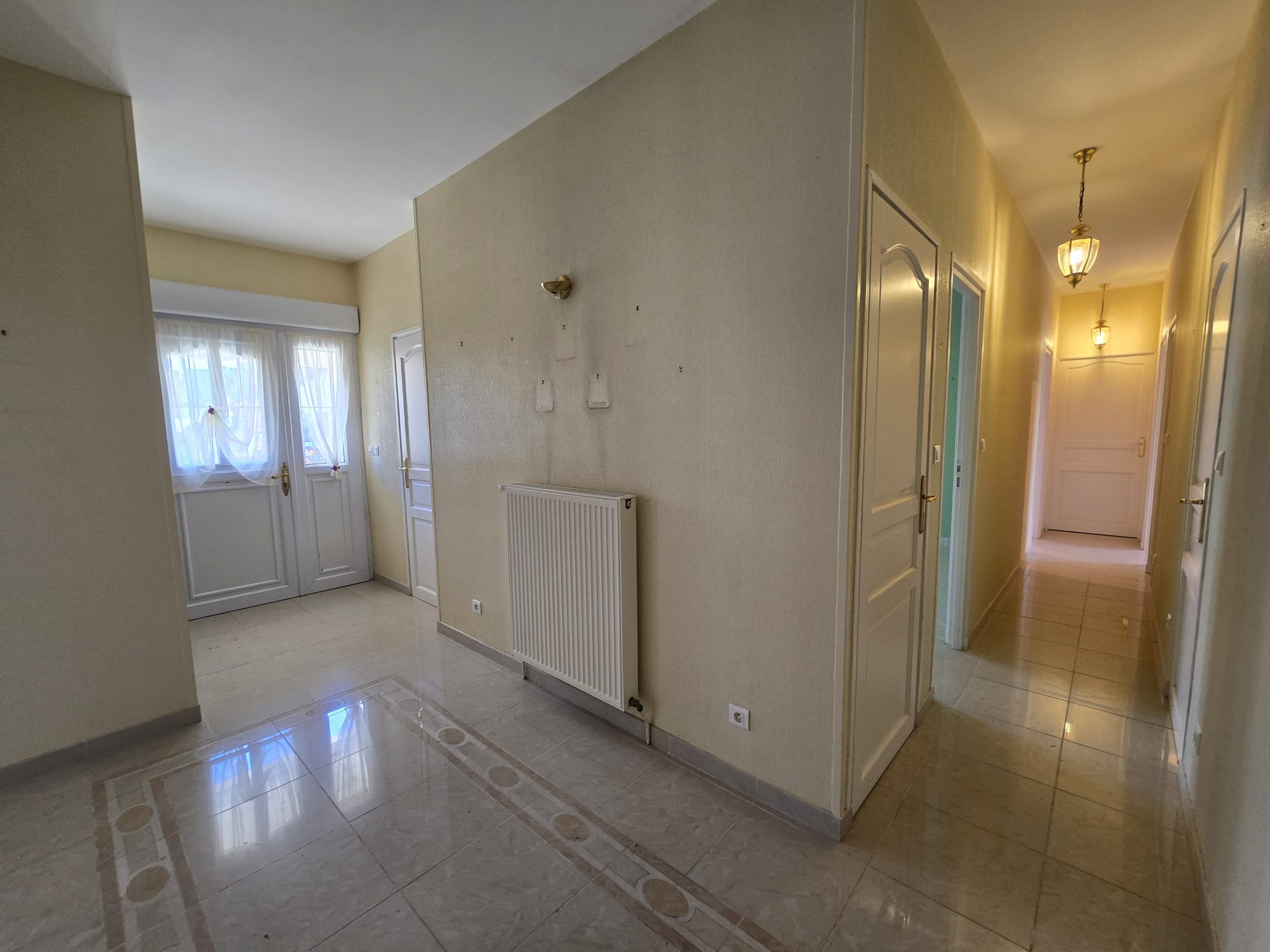 Entrée, salon-séjour de 45m², cuisine équipée ouverte, véranda, trois chambres, salle d'eau, wc.