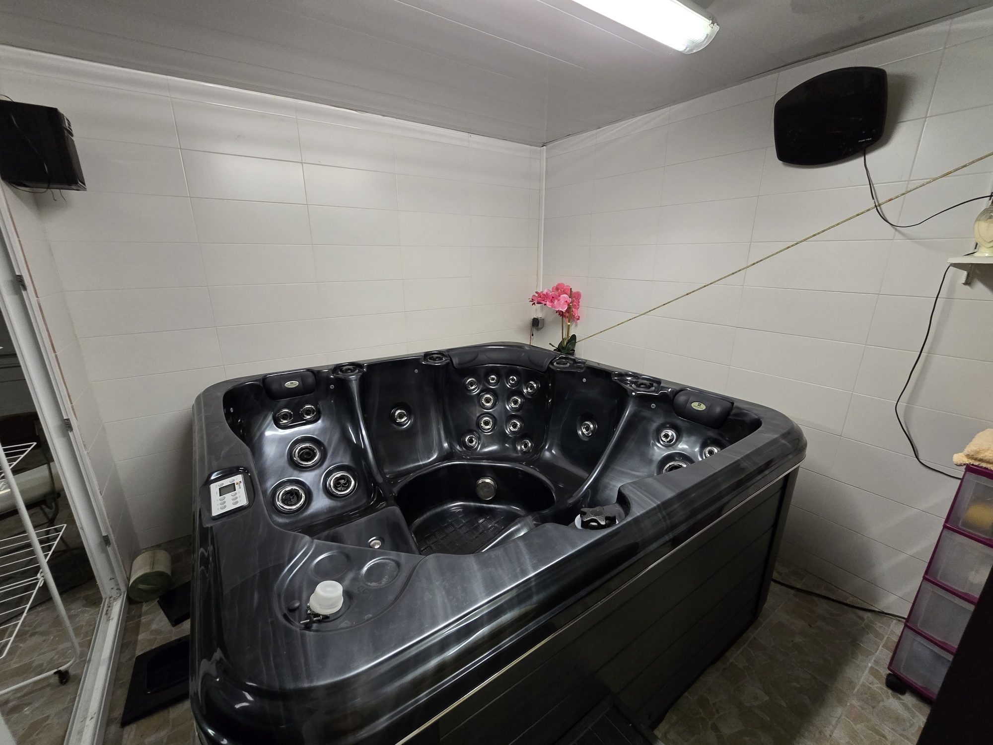 Sous-sol complet comprenant : salle de sport, jacuzzi, grande salle de jeux et double garage.